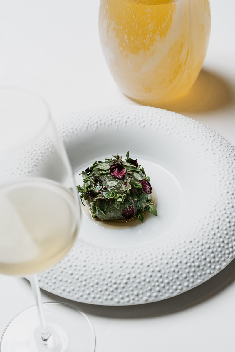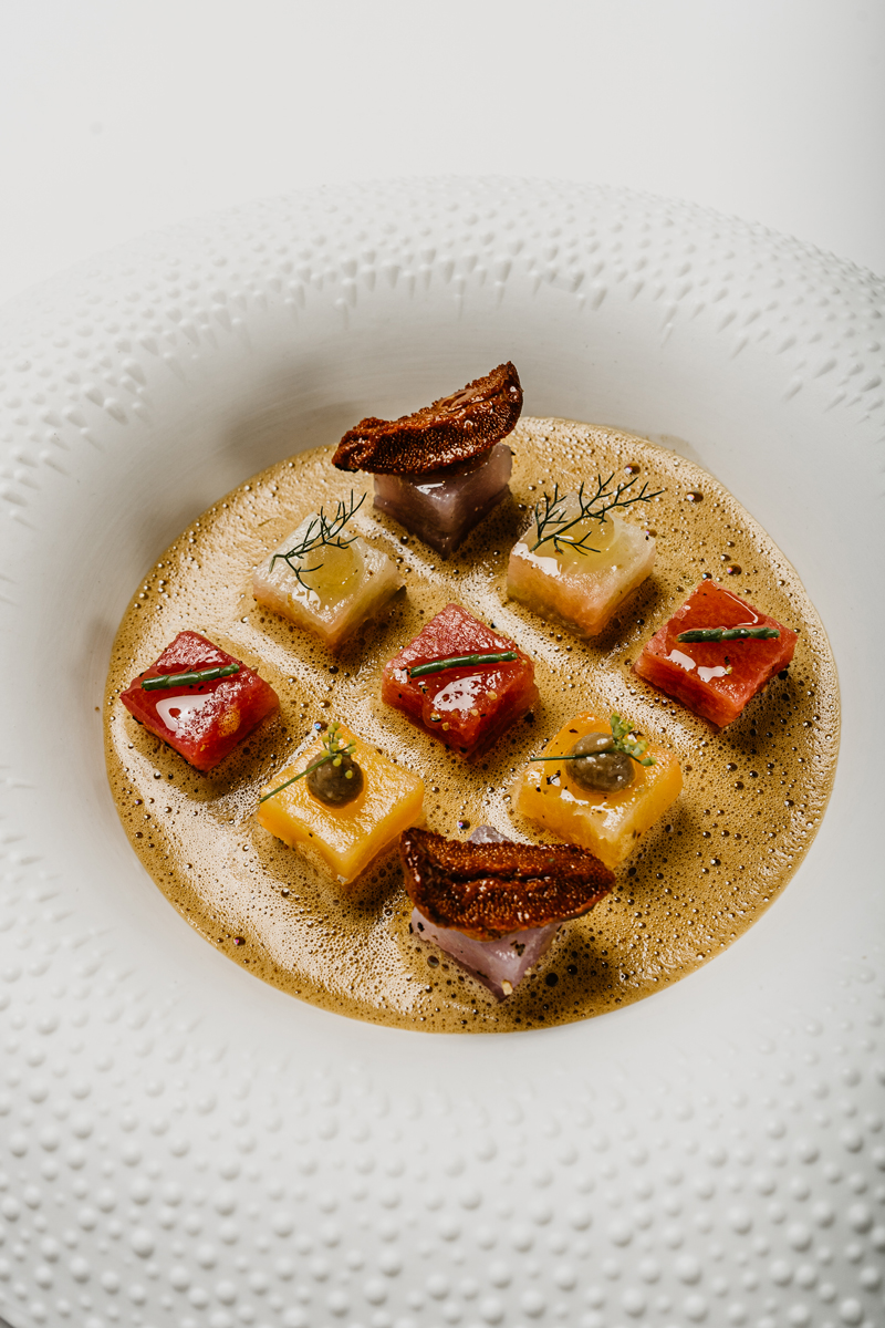 Pour le dressage, faite chauffer vos cubes de légumes dans un four chaud à 110 degrés pendant 2 minutes, dans votre assiette déposer 6 point de condiment racines puis les 9 cubes (des 4 légumes racines tailler) déposer harmonieusement pour former un cube, faite mousser votre jus à l’aide d’un bas mixe, décorer de salicorne, de fenouil sauvage, et de vos langues d’oursins, en guise de conclusion de cette création « racine carrée », préparer votre cappuccino, d’abord le consommé chaud (50 degrés maximum), votre écume de langues d’oursin et votre poudre de racines carrée torréfier, ainsi que votre faux sucre.