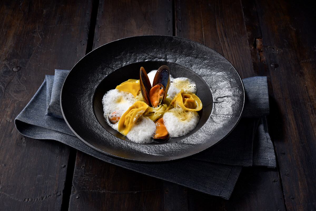 Disposer un peu de fondue de poireau. Disposer trois ravioles, trois belles moules décortiquées. Ajouter l’aïgo boulido émulsionné et quelques gouttes de sabayon. Disposer une belle moule bien nettoyée en décoration.