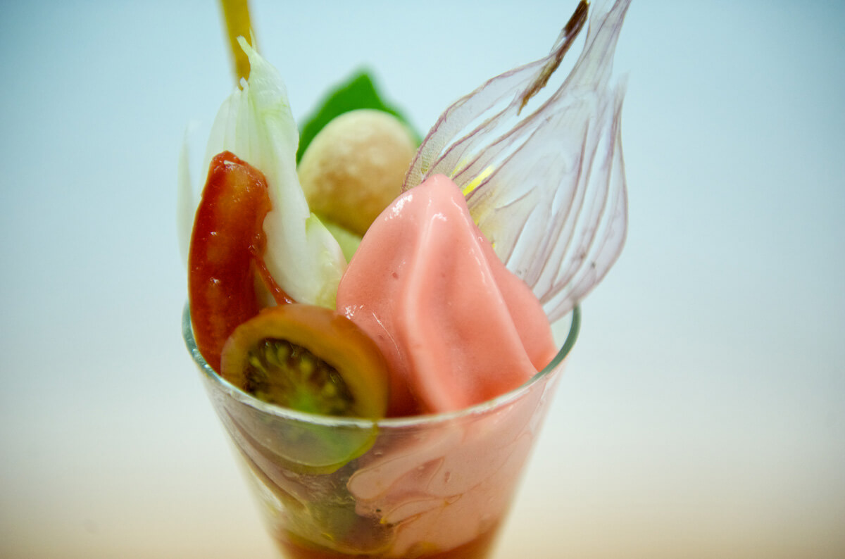 Ajouter une quenelle de sorbet, puis un peu de chantilly et la lamelle d’oignon.